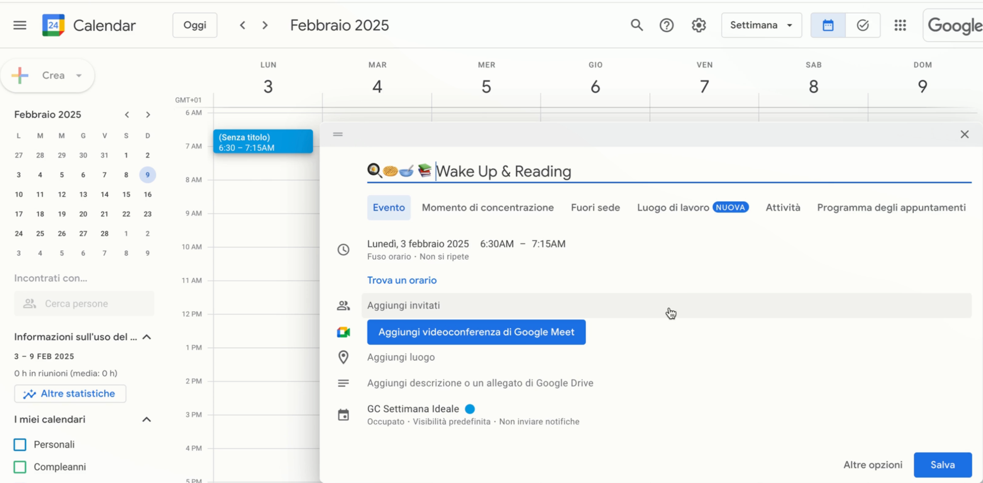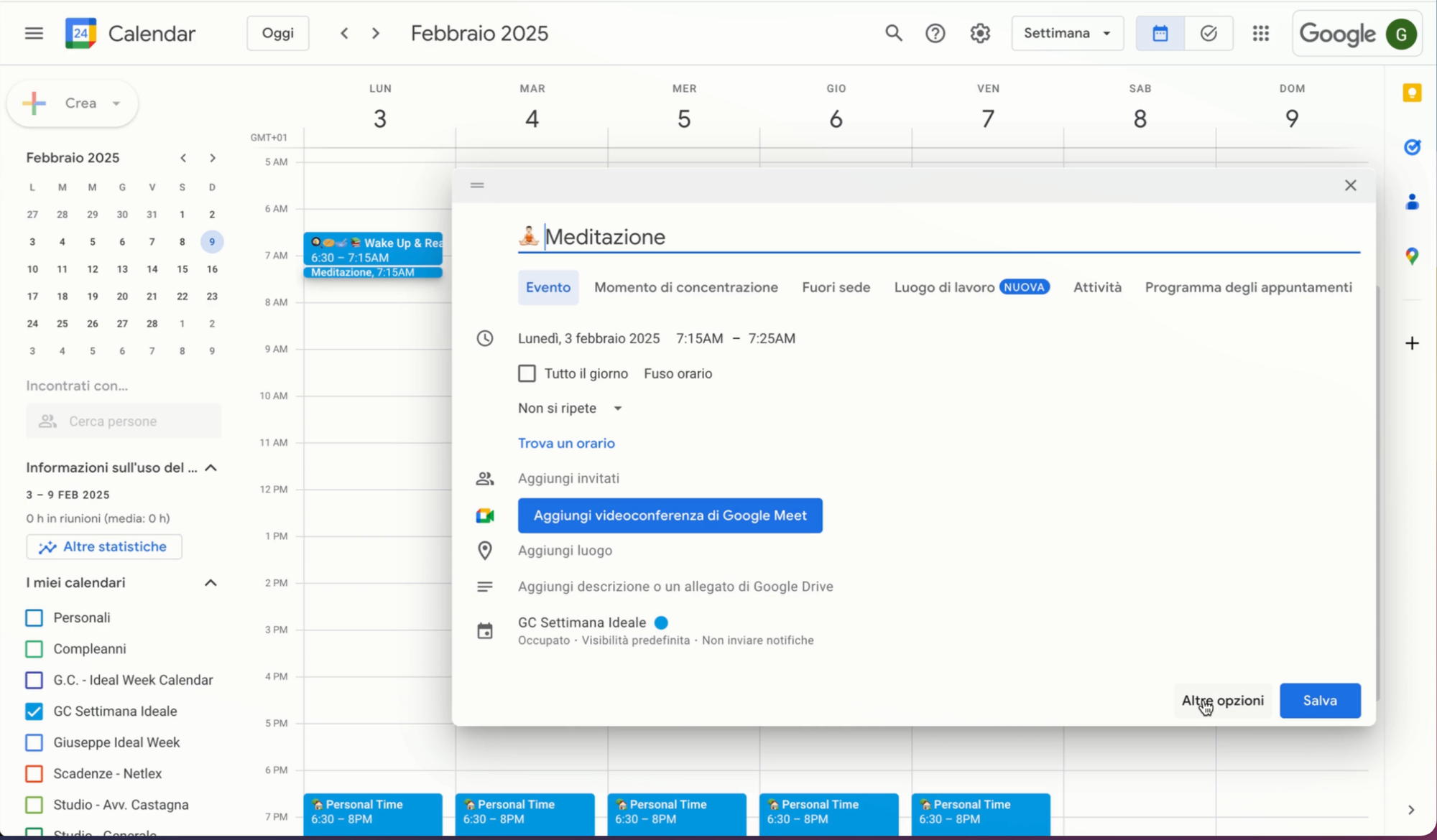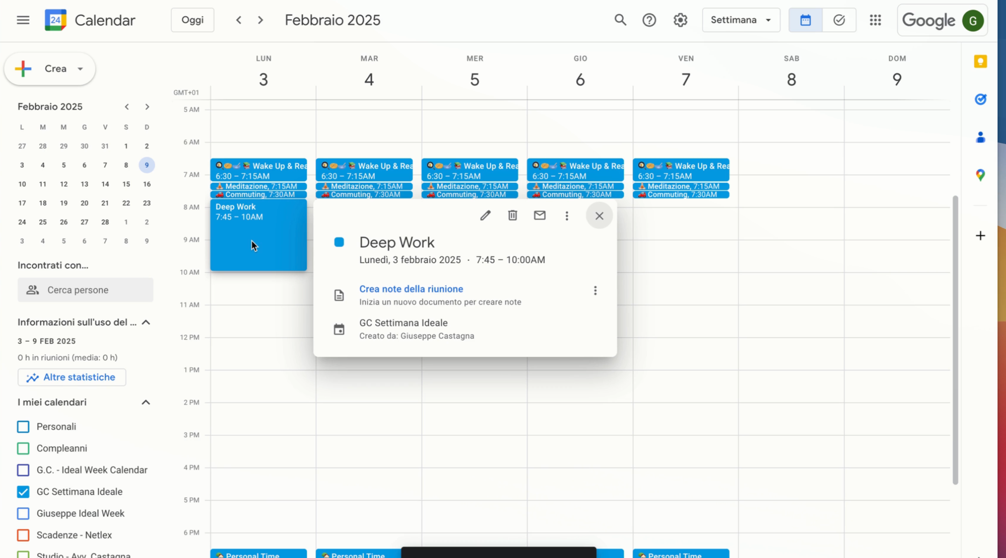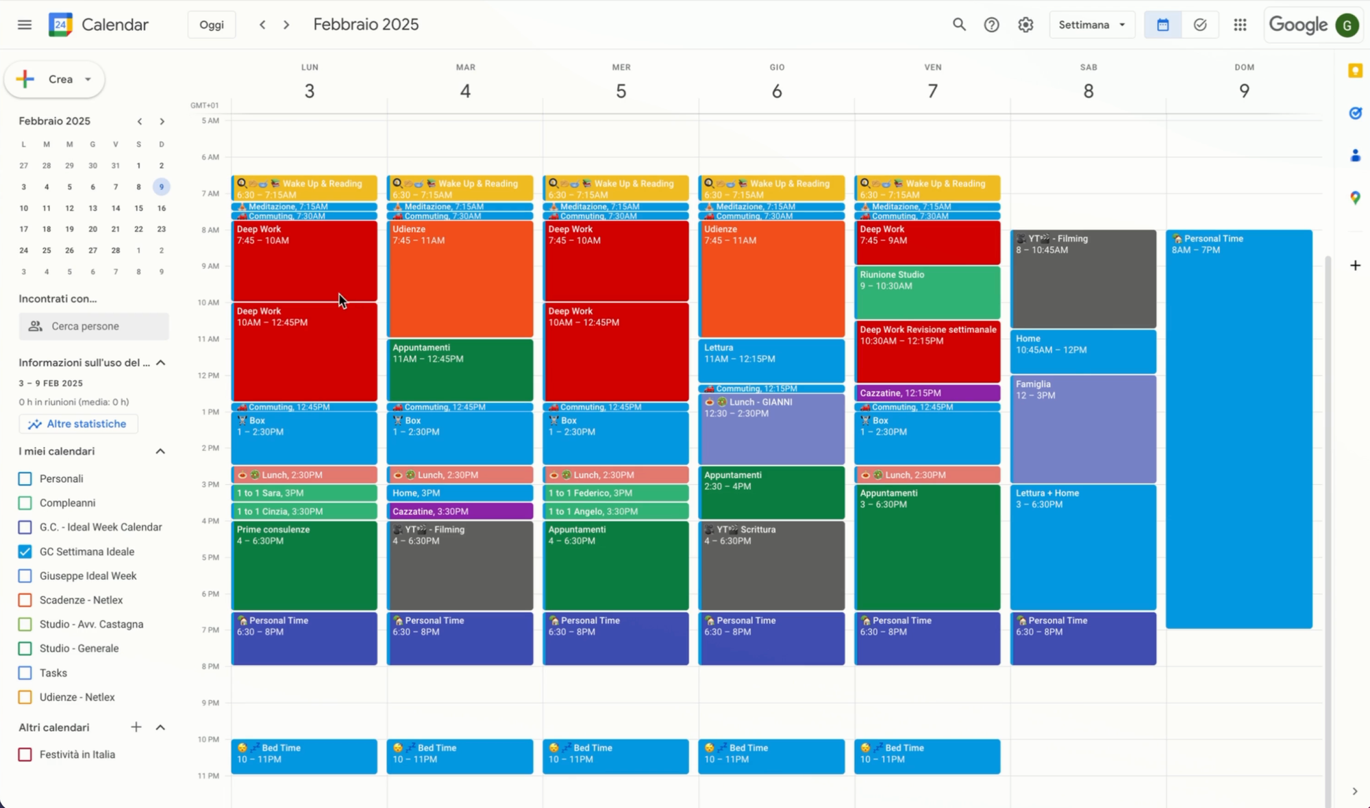 • Lavoro: Che include non solo le attività lavorative, ma anche momenti di pianificazione, deep work, riunioni e incontri one-on-one.