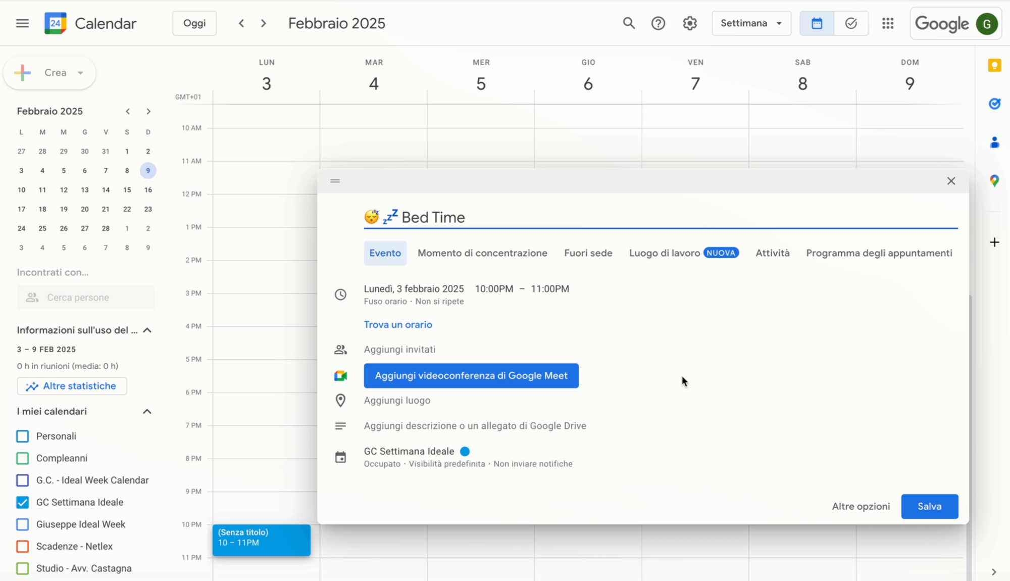 • Routine Serale: Un blocco “Bad Time” dalle 22:00 alle 22:30 per prepararti al sonno.