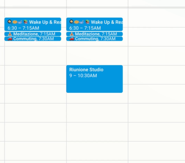 • Blocchi di Tempo Fissi: Inserisci gli orari base della giornata, come il momento del risveglio, le routine mattutine e serali, il sonno, e il tempo dedicato alla famiglia.